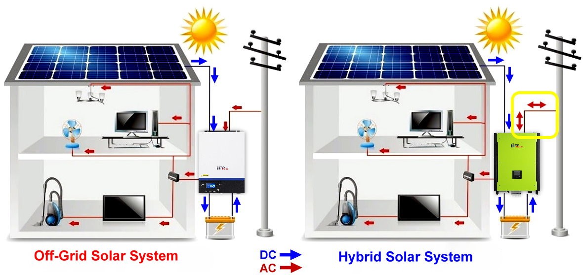 How It Works: Combines features of both grid-tied and off-grid systems. Solar panels supply energy to the home and charge the batteries. Any surplus can either be stored or sent to the grid. In case of a grid failure, the batteries provide backup power.